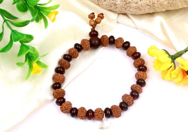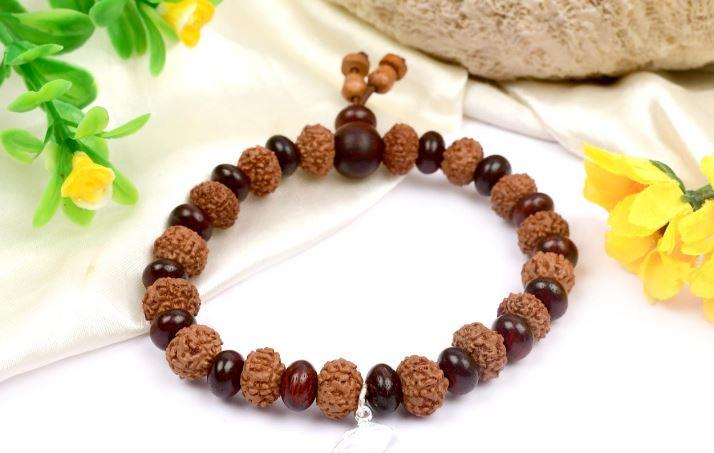 The attractive Bracelet is endowed with the blessings of Goddess Mahalaxmi, the Goddess of wealth, prosperity, good fortune, riches, success, name, fame, material abundance and contentment. The 7 Mukhi is ruled by Planet Venus and so the Bracelet is effective in giving relief from malefic Venus. 7 Mukhi Mahalaxmi Bracelet with Red Sandalwood Beads is strung with superior quality 7 Mukhi Java Rudraksha Beads and perfectly round Red Sandalwood Beads on adjustable string.\n\n \n\nRed Sandalwood Beads have a soothing effect, brings peace, serenity, good luck, eliminates negative energies, enhances concentration, controls anger and aids in meditation.\n\n \n\nThe combination of the two Beads makes the 7 Mukhi Mahalaxmi Bracelet with Red Sandalwood Beads makes this Bracelet wholesome and a must have for everyone.\n\n \n\nRuling deity: Mahalaxmi\n\nOrigin: Java\n\n \n\nMantras:\n\nBeej Mantra: Om Hum Namah\n\nDeity Mantra: Om Mahalakshmi Namah\n\n \n\n7 Mukhi: approx. 10 mm (16 beads)\n\nElliptical Red Sandalwood: approx. 8 mm (16 beads)\n\nLength: approx. 7.5 inches stretchable