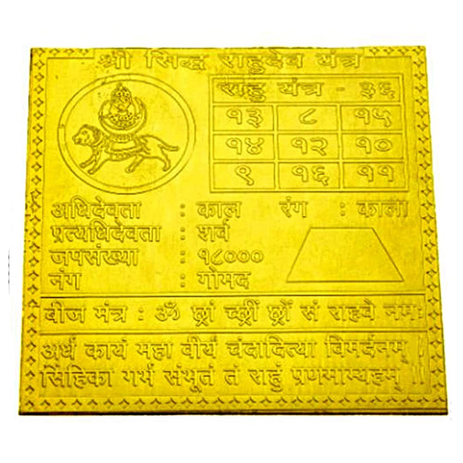 Rahu Yantra removes/reduces all the negative and malefic effects of Rahu. Typical problems of unfavorable Rahu are loss of money, no savings, irritation, separation from home, displeasure, fear complex, slow working, change of residence, disfavor of superiors. It suppresses all these problems and brings the blessings of Lord Bhirav/Hanuman by providing knowledge, deep understanding and respect. It also improves one’s personality by making him active in life.Rahu being the significator of foreign travels, unusual employments, creativity, pilgrimage, air travels, politics, masochism, and renunciation etc., the Rahu yantra enhances the good results and reduces/removes bad effects.It is highly recommended and advised that natives with adverse dasha/transit of Rahu should install and worship the yantra as a remedy to nullify the malefic effects..