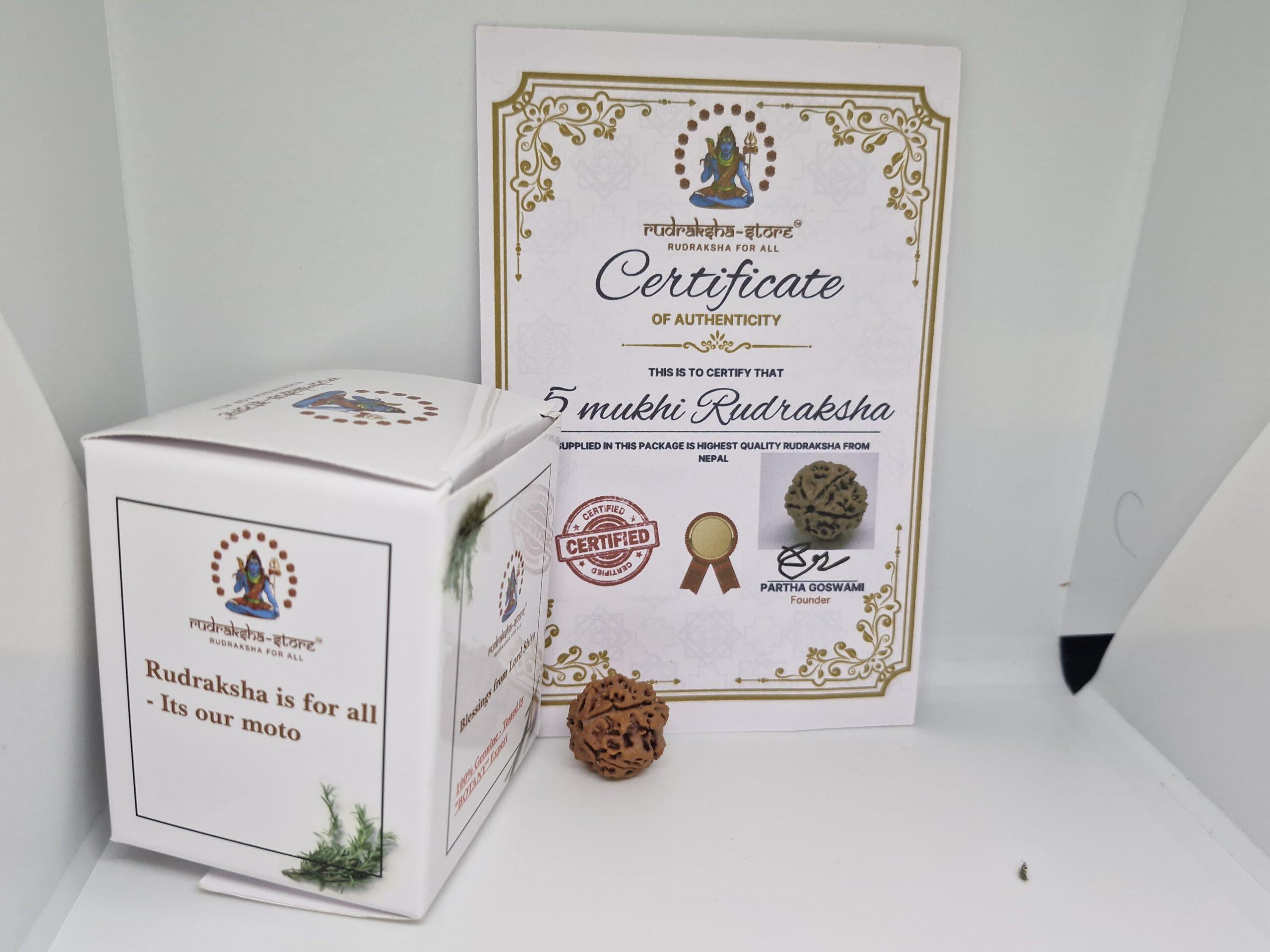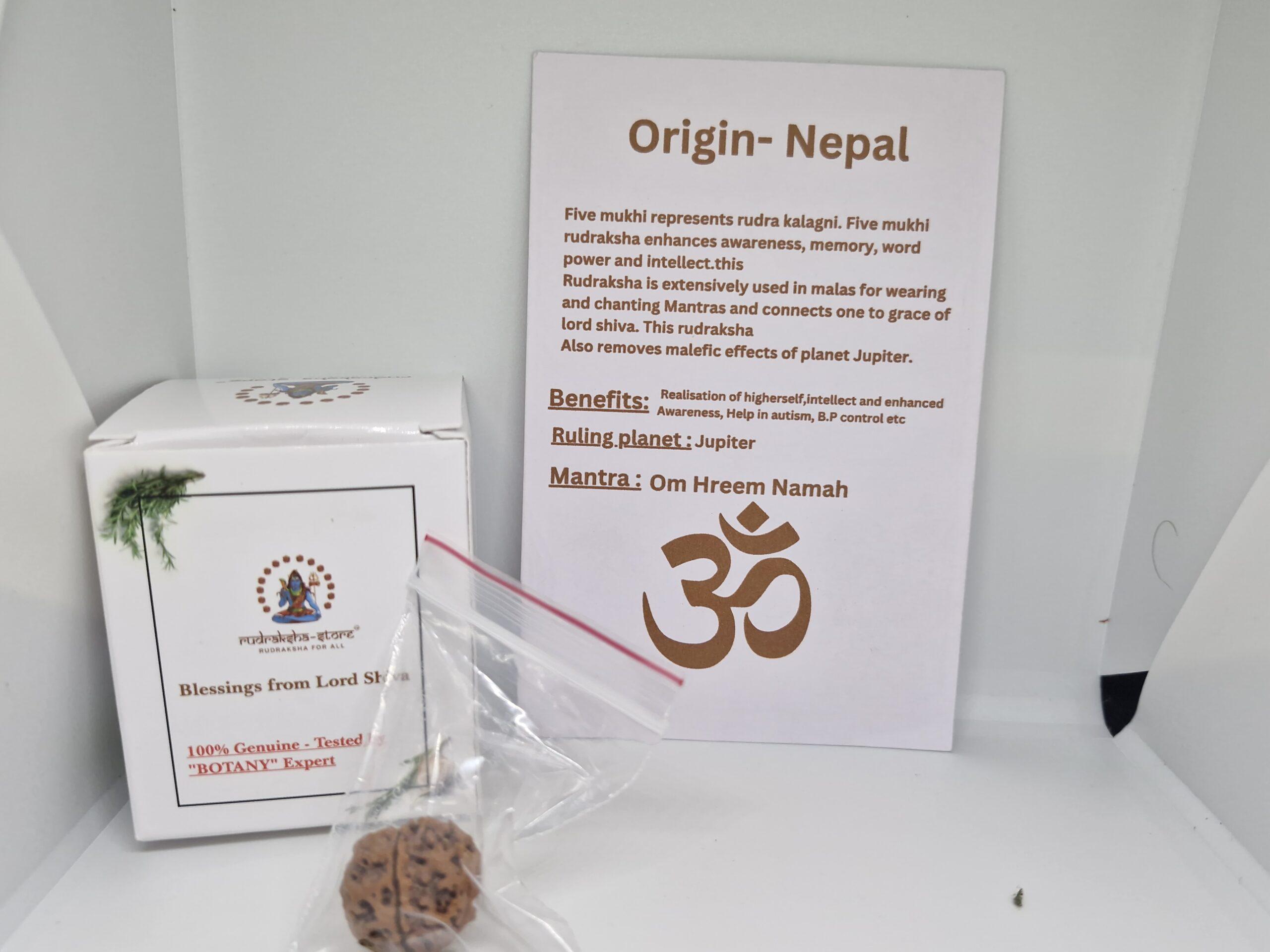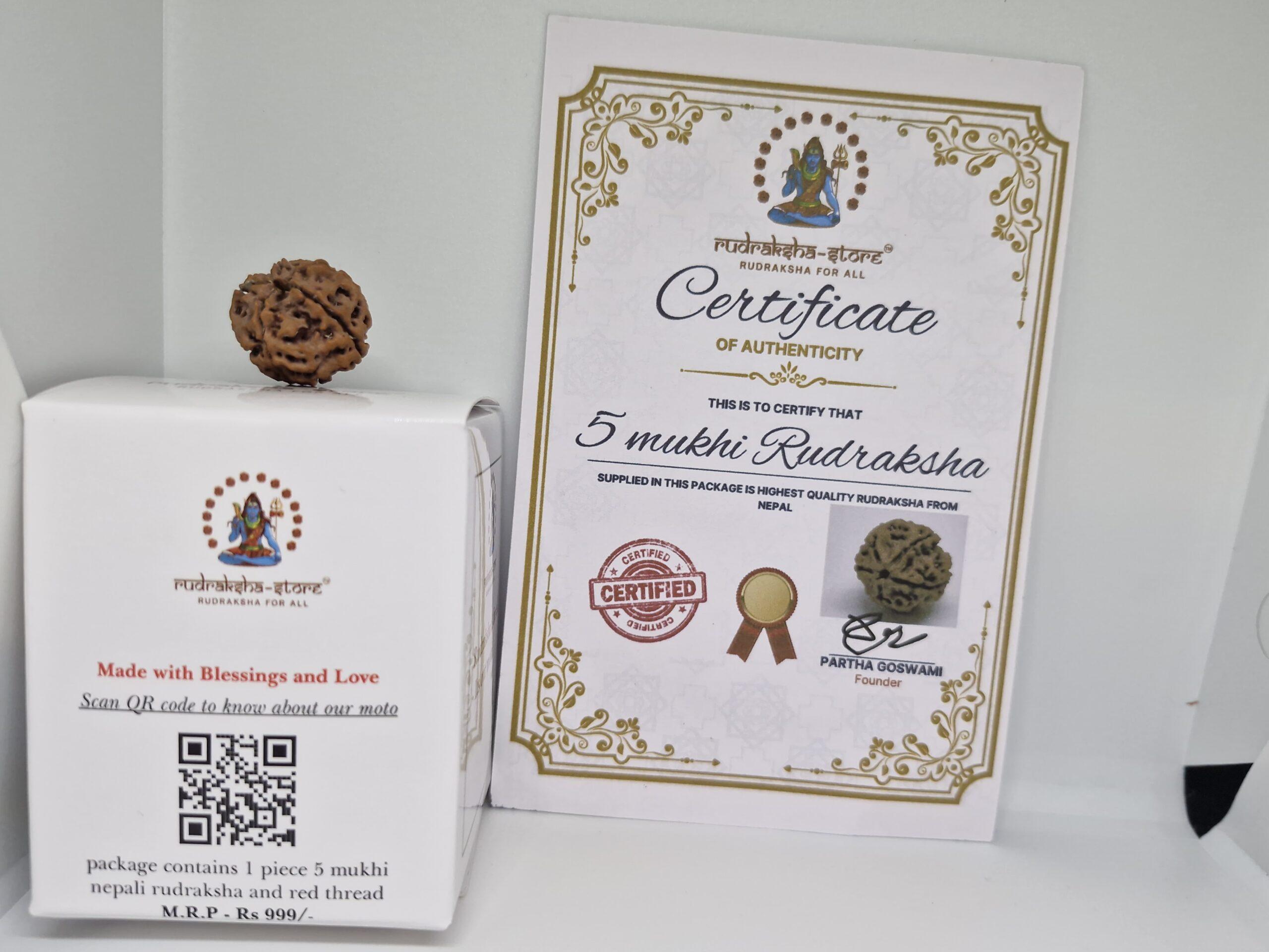 Five Mukhi Rudraksha is a symbol of five forms of Lord Shiva, named as RudraKalagni. It helps the wearer to gain good health and peace. It helps to attain success in all walks of life and helps in gaining knowledge, wealth, power and fame. It also cultivates wisdom and intellect.Paanch 5 Mukhi Rudraksha Nepal maintains the balance of five elements i.e. Agni (fire), Jal ( water), Vaayu (Air), Aakash ( sky), Prithvi ( Earth) in the wearer’s body and makes his body highly immune to fight different diseases in different weather. The most compatible day for wearing this Rudraksha is Thursday. One should wear the Rudraksha only after Purification.\n\n \n\nSize- 19mm-21mm