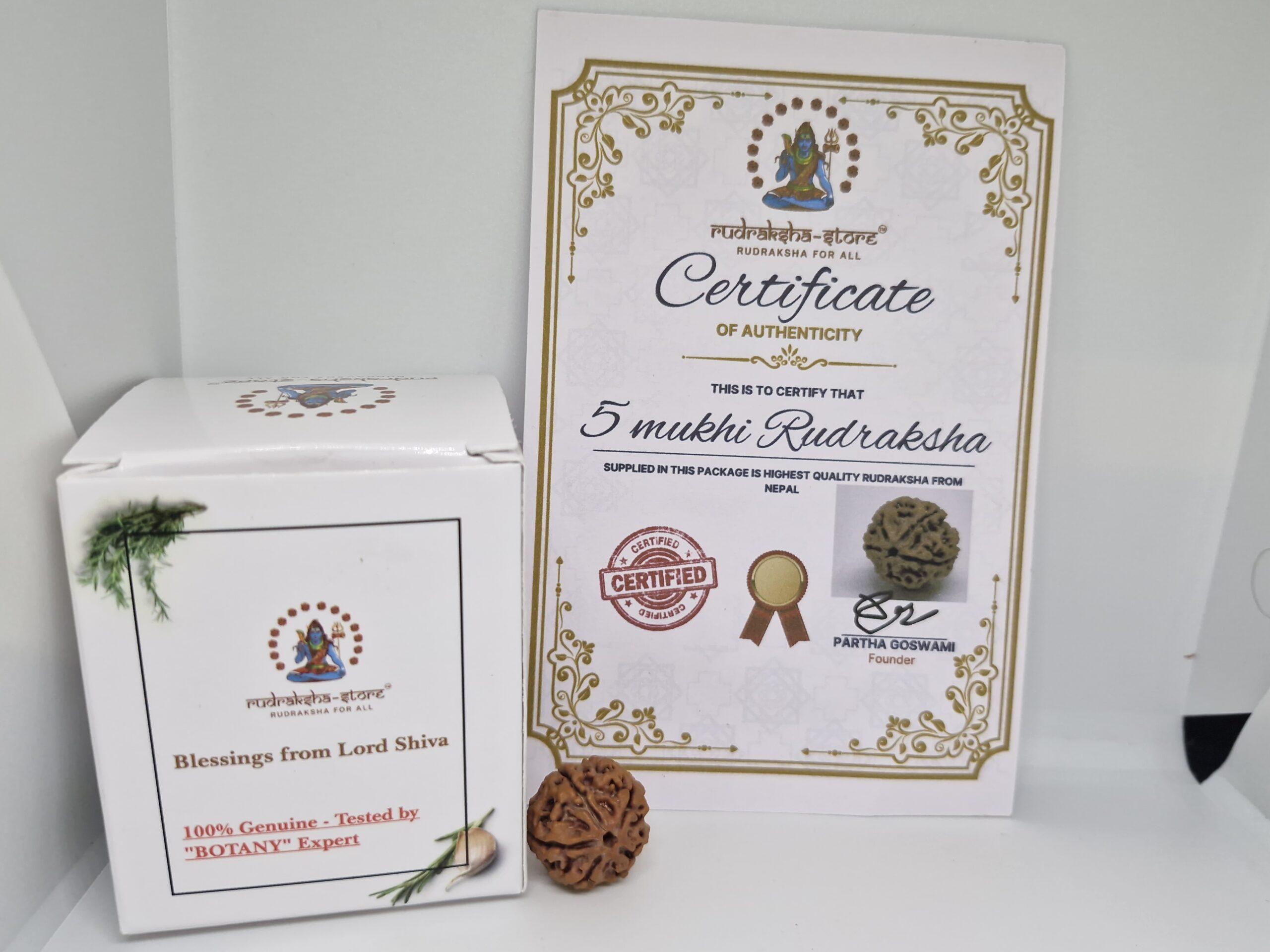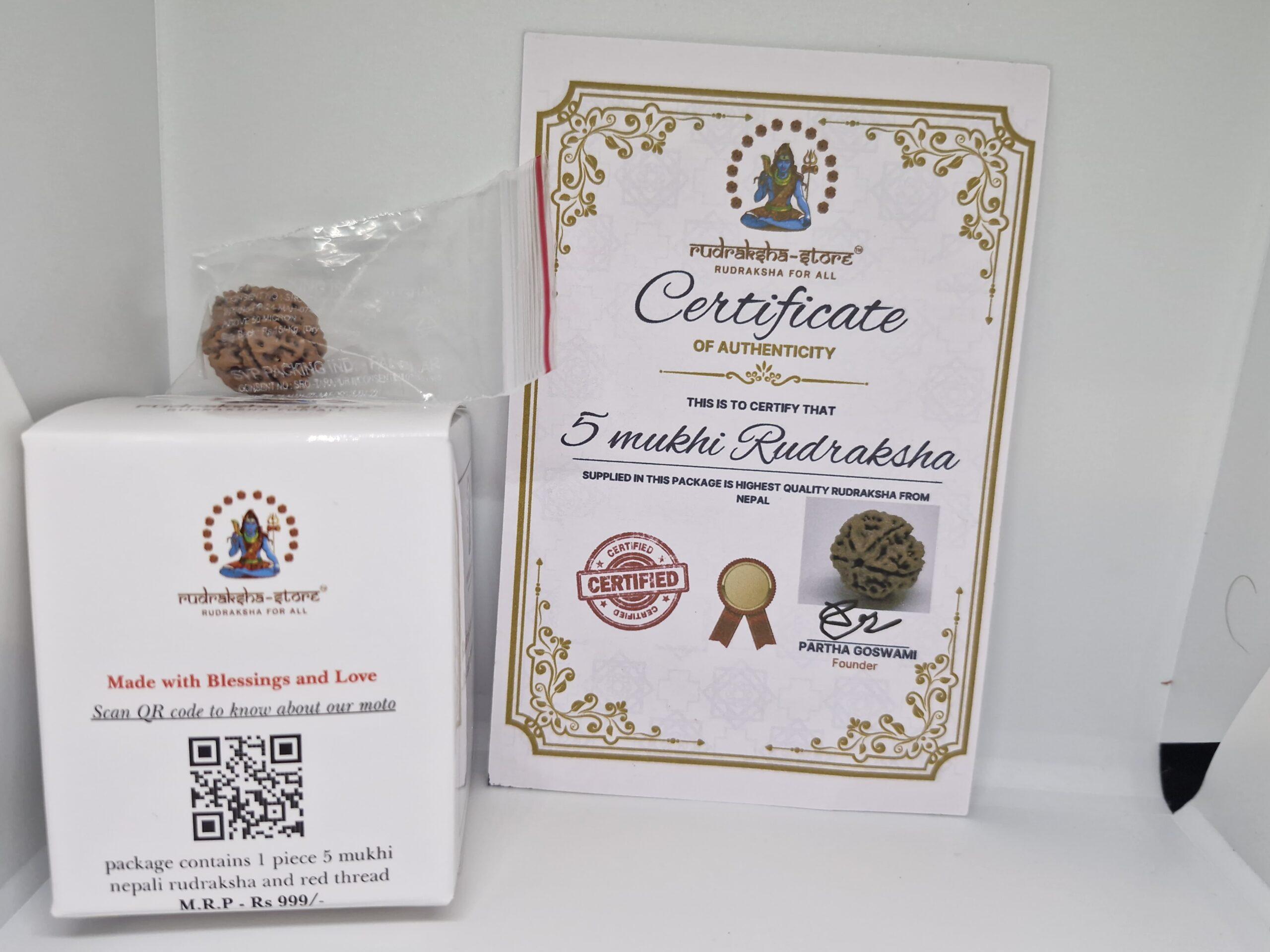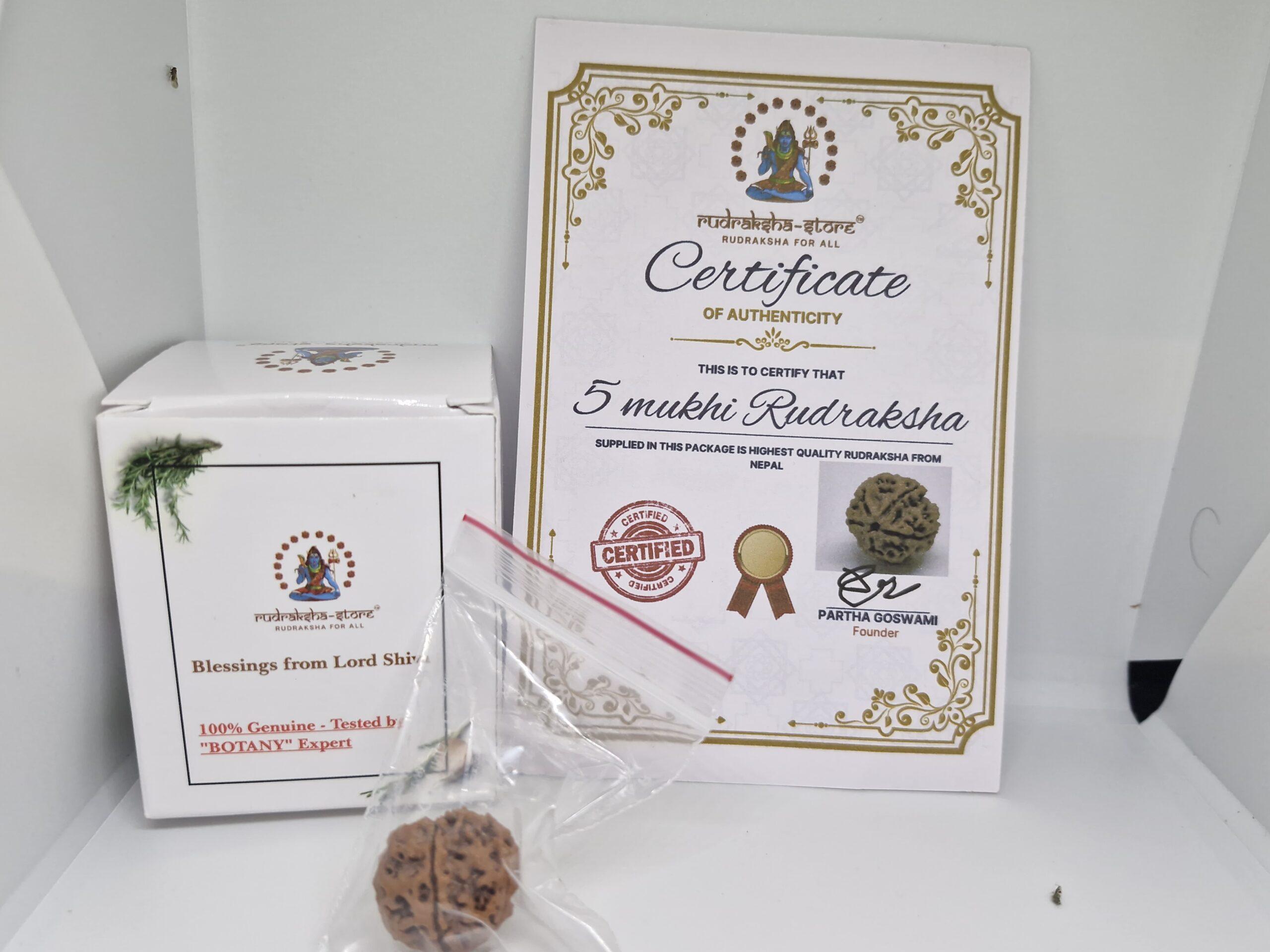 Five Mukhi Rudraksha is a symbol of five forms of Lord Shiva, named as RudraKalagni. It helps the wearer to gain good health and peace. It helps to attain success in all walks of life and helps in gaining knowledge, wealth, power and fame. It also cultivates wisdom and intellect.Paanch 5 Mukhi Rudraksha Nepal maintains the balance of five elements i.e. Agni (fire), Jal ( water), Vaayu (Air), Aakash ( sky), Prithvi ( Earth) in the wearer’s body and makes his body highly immune to fight different diseases in different weather. The most compatible day for wearing this Rudraksha is Thursday. One should wear the Rudraksha only after Purification.\n\n \n\nSize- 19mm-21mm