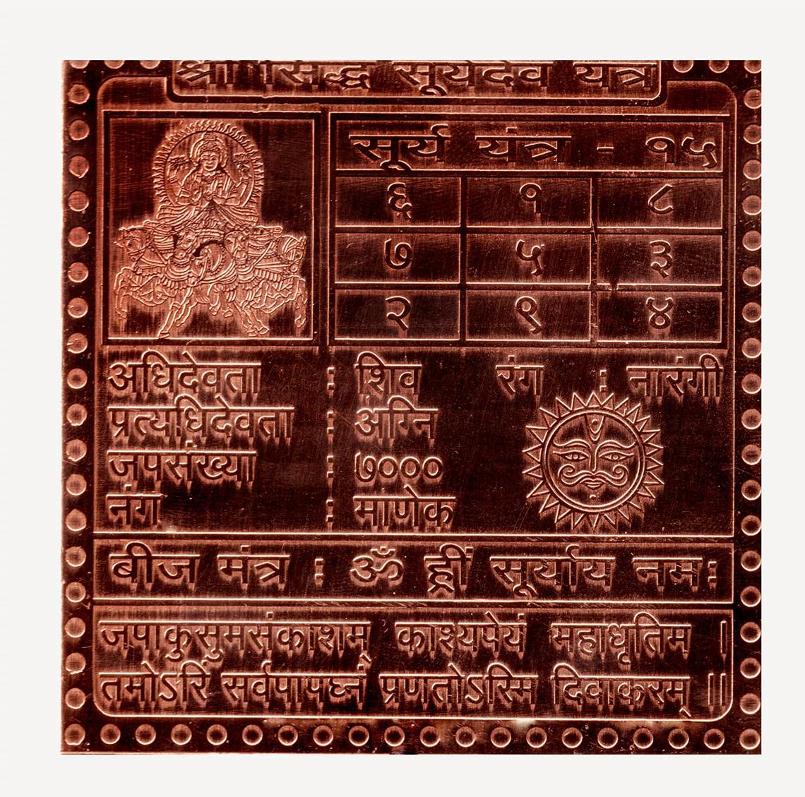 The power of Surya, the sun god, is conceived of as dispelling darkness both spiritual and earthly, curing disease, heating and illuminating the world. Sun stands for power and authority. When one is deprived of happiness through termination of service, suspension or through opponents or diseases etc., then such difficulties are overcome and cure from disease is attained with good health through Pooja of Surya Yantra. Surya Yantra enhances the peace of mind, gets favor from Superior, officers and Govt. The Surya Yantra after Pooja is worshipped in temple of your house. By the use of Surya Yantra enemies are suppressed and eliminated the malefic effects of Sun. When Sun is Malefic in birth Chart of a native or according to the rashi based on his name the planet indicates malefic effects then the Surya Yantra is very useful.