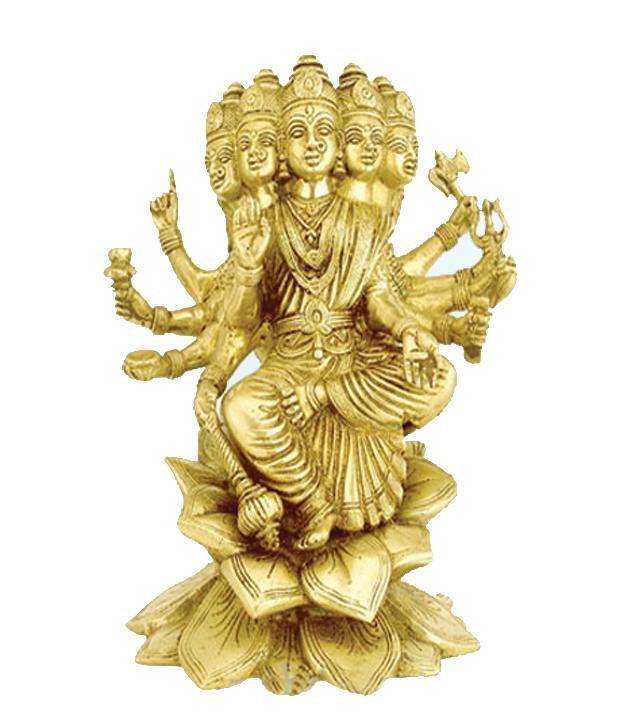 This brass statue of Gayatri Maa is meant for decorating your home in Hindu way.Gayatri Devi is typically portrayed as seated on a red lotus, signifying wealth. She appears in either of these forms: Having five heads (Mukta, Vidruma, Hema, Neela, Dhavala) with the ten eyes looking in the eight directions plus the earth and sky, and ten arms holding all the weapons of Lord Shiva, Lord Vishnu & Lord Brahma. Accompanied by a white swan, holding a book to portray knowledge in one hand and a cure in the other, as the goddess of Education.She is an aspect of Mata Saraswati, Mata Lakshmi & Mata Parvati, all three in one form, a form of Adi Shakti, possessing the Rajasi Guna and hence is the source of Brahma's power. Without her, Brahma remains dormant or unable to create.