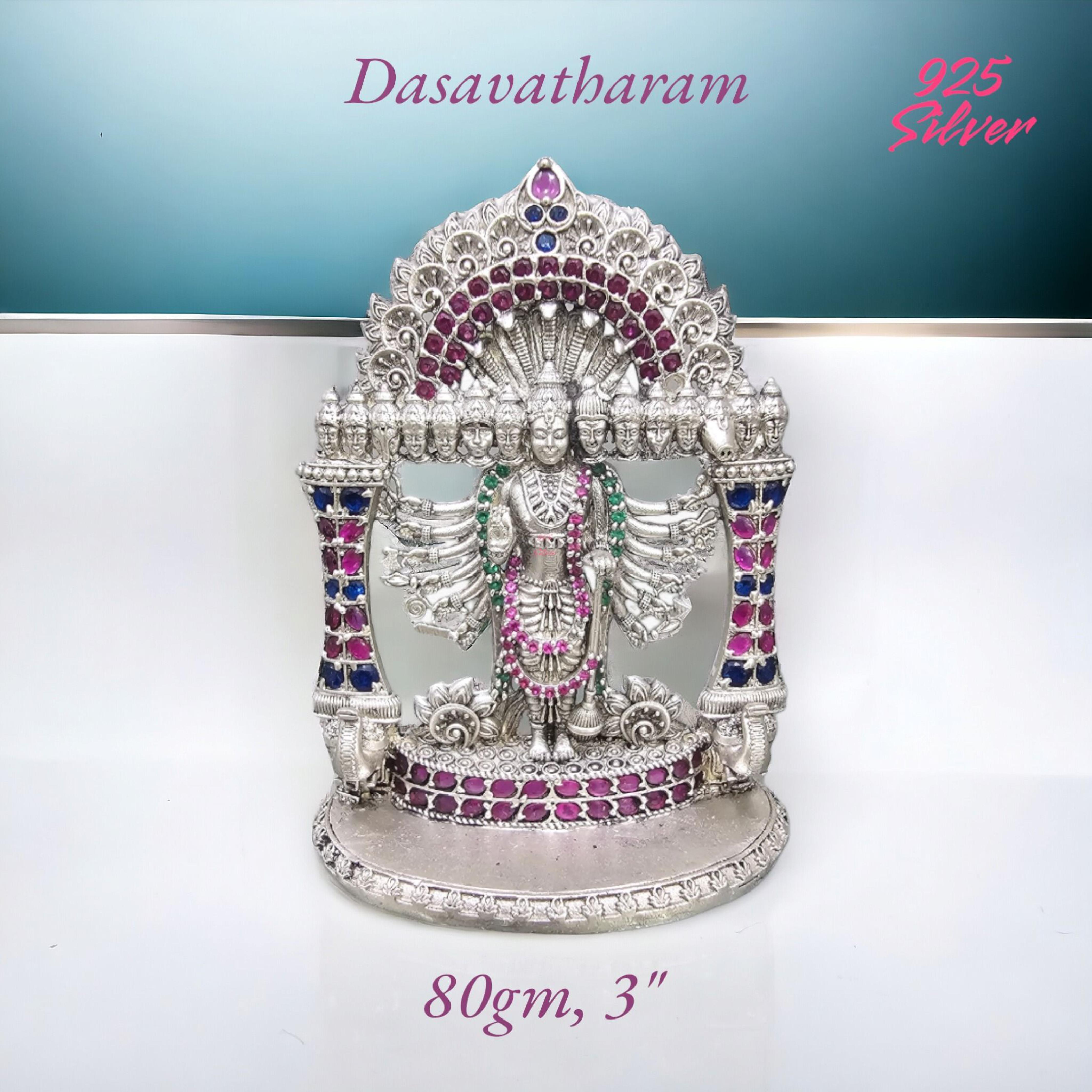 This LORD VISHNU DASHAVTAR IDOL SILVER is a perfect choice for adding a touch of spiritual beauty to your home or workplace. Featuring ten incarnations, MATSYA, KURMA, VARAHA, NARASIMHA, VAMAN, PARASHURAM, RAMA, BALARAM, BUDDHA, and KALKI, this sculpture is crafted from high-quality silver.