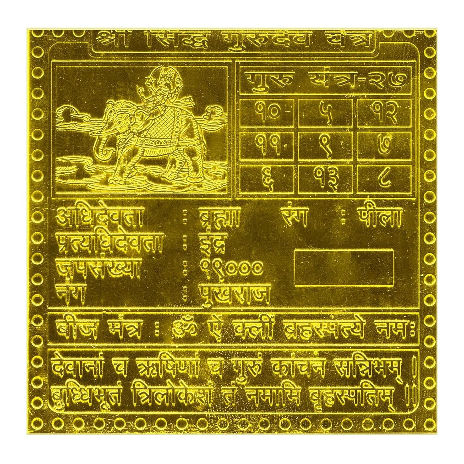 Guru Yantra bestows the blessings of Lord Vishnu and Brahma along with the positive reflections of planet Jupiter. It bestows knowledge, prosperity and peace to the devotee. Guru Yantra is good for those having problems with studies.Planet Jupiter corresponds with this Guru Yantra or Jupiter Yantra or Brihaspati Yantra. It builds kind of positive environment around you. Conflicts are to die down and you enjoy a harmonious relationship. It helps you to acquire knowledge and adds to your wisdom. The business person is to expand his business. Career oriented gets a highly responsible position in a reputed organization. If spiritually inclined, you can achieve a higher level. You remain in strong financial position.